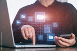 Person using laptop and smartphone to manage files and tasks in a workspace during daytime