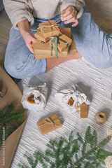 Eco Christmas gifts in kraft paper, handmade wrapping with twine and green ribbon, recycled materials on cozy floor, sustainable holiday packaging, zero-waste present ideas, natural festive vibe.
