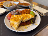 Traditional meal with kebab and bulgur. Turkish cuisine. Food culture, dining, cuisine, appetite, lunch flavor and restaurant serving experience.
