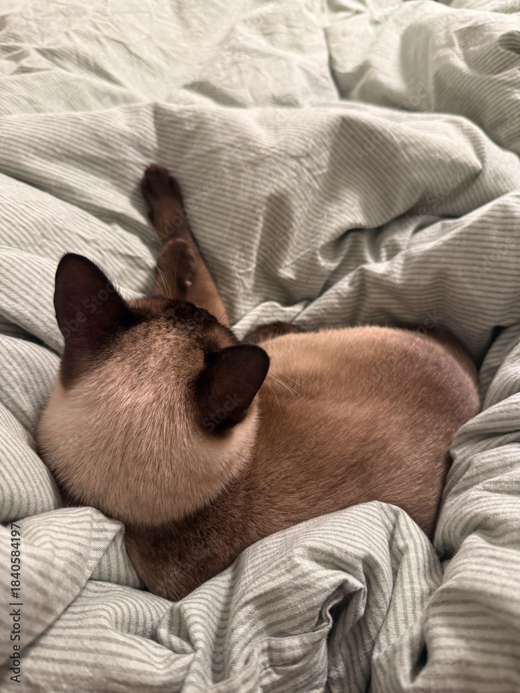 Siamese cat relaxing on blanket viewed from above close-up. Cozy home atmosphere, peaceful rest, soft bedding texture and calm domestic mood.