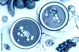 Gazpacho soup in bowl with ingredients over white stone background. Cold tomato soup. Healthy food concept. Top view, flat lay. High quality photo