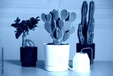 Beautiful prickly pear cactus in pot, watering can and other houseplants on light grey table