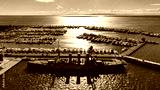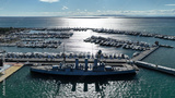 Aerial drone photo of small port and Park of Maritime Tradition where historic Averof warship is anchored, Floisvos, Faliro Marina, Attica, Greece