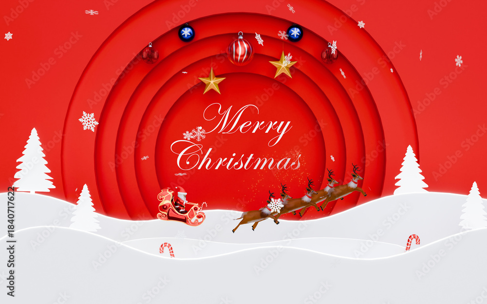 Merry Christmas festive composition showing Santa Claus, reindeer, snowflakes, and holiday ornaments on a vivid red layered background 3D Rendering