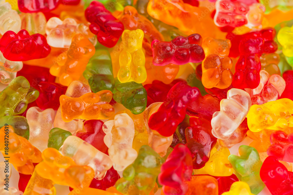 Colorful gummy bears on display in various shapes and sizes