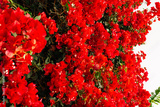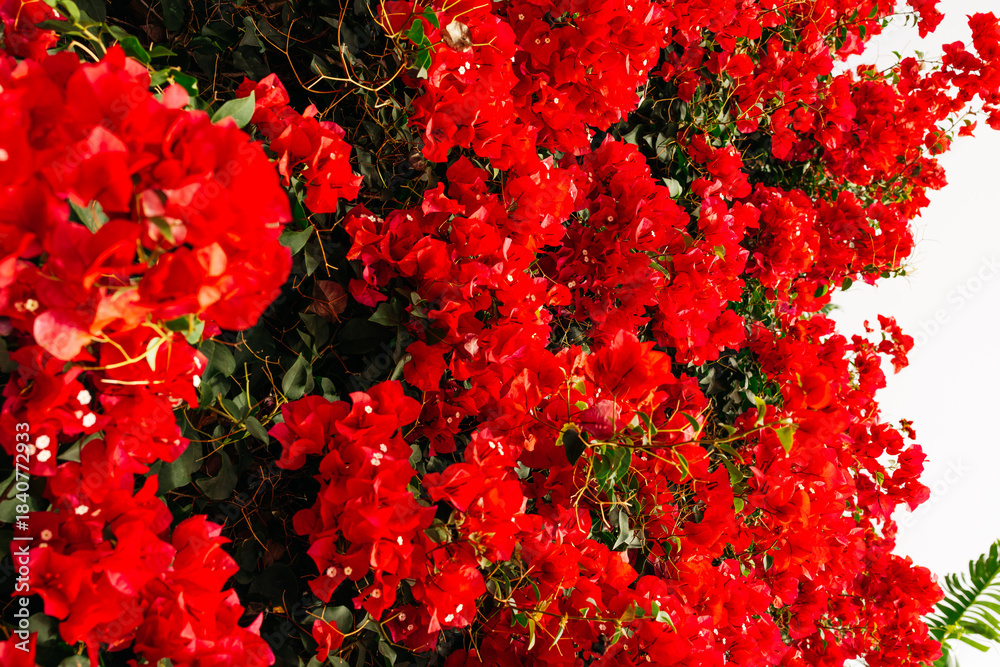 Vibrant red bougainvillea flowers bloom abundantly on a lush green backdrop, creating a stunning visual display of nature's beauty and color in a garden setting