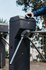 Individual using smartphone to access automated turnstile, showcasing modern technology and convenience in urban transportation systems with sleek design and functionality