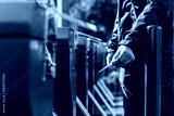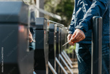 Individual in blue jacket using a transit card at automated ticket gate, showcasing urban transportation access and modern commuting experience with technology