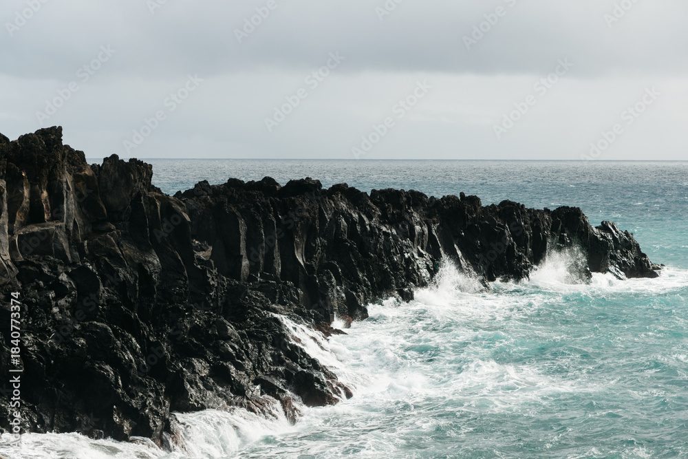 Rocky coastline with crashing waves, showcasing dramatic cliffs and turquoise waters under a cloudy sky, creating a serene yet powerful natural landscape