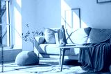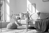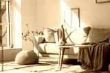 Stylish interior of living room with cozy sofa and coffee table with decor