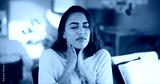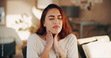 Sick, pain and woman with sore throat on sofa for flu symptoms, viral infection and discomfort. Health, person and influenza in home with difficulty swallowing, virus inflammation and swollen gland