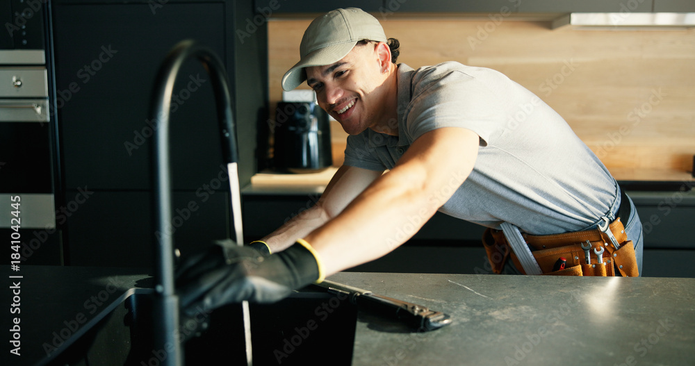 Faucet, maintenance and repair with plumber in kitchen of home for installing or testing water supply. Checking, plumbing fix and tap with man in apartment for inspection or renovation as contractor