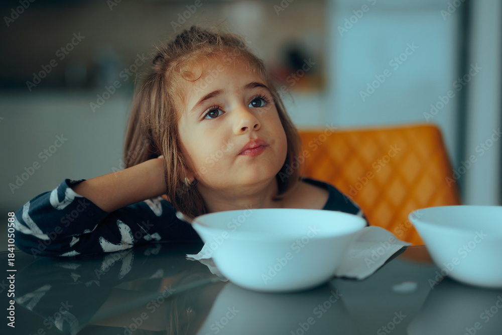 Little Girl Waiting for the Milk and Cereal Breakfast. Hungry kid wants to have her meal as fast as possible