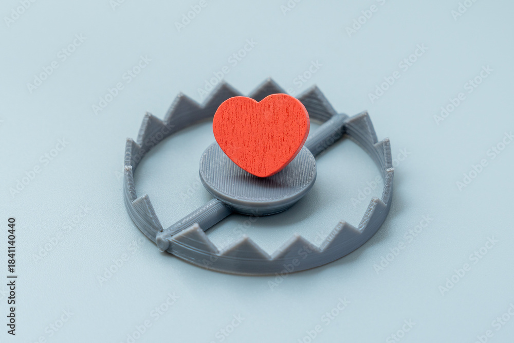A red heart is placed inside a bear trap. Betrayal, heartbreak, relationship risk, love trap, toxic relationships concept.