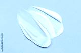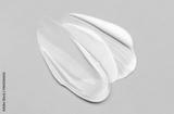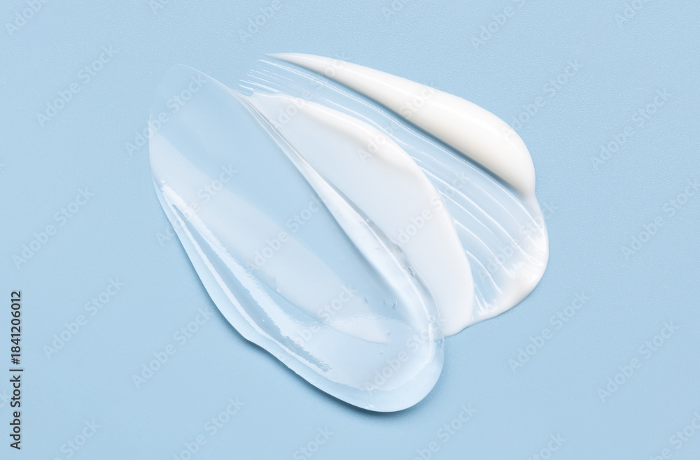 Close-up of cosmetic smear of creamy texture on gray background, blue background