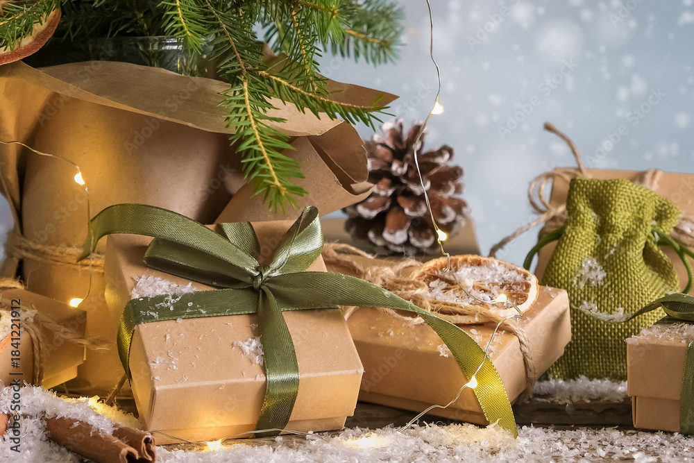 Christmas gift zero waste, eco friendly hand made box packaging gifts in kraft paper wooden table, eco christmas holiday concept, Christmas gift wrapping,eco decor banner