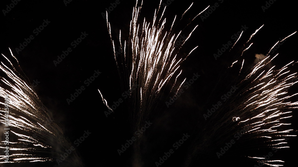 Amazing real beautiful colorful fireworks background on celebration night event for happy new year party, Abstract Multi color golden firework in the night sky
