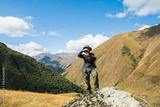 Successful hiker taking a photo on a rocky peak in Juta Village, Georgia. Mountain climbing adventure with panoramic views, sunny blue sky, and active outdoor lifestyle in the Caucasus Mountains.