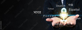 Businessman presenting artificial intelligence language translation above his open hand. Glowing AI logo inside a virtual microphone surrounded by several languages