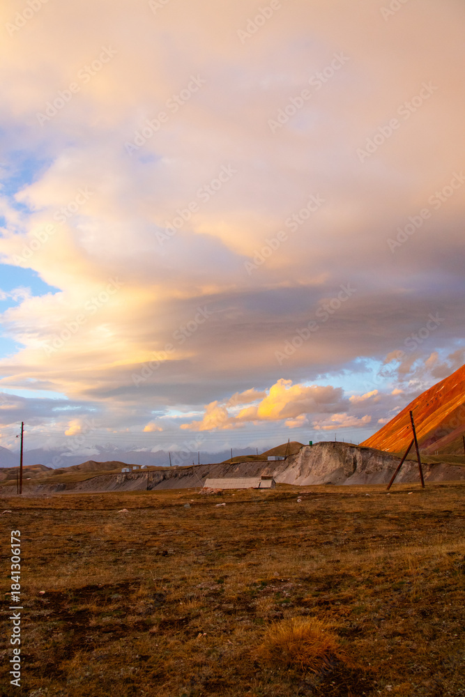Scenic landscape featuring a vast sky filled with golden and orange clouds over a rural mountain valley