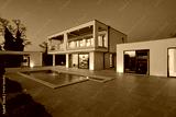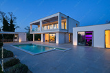 Exterior view of a modern luxury house with a swimming pool at twilight. Illuminated two-story white villa with large glass windows, patio, terrace, and glowing blue water
