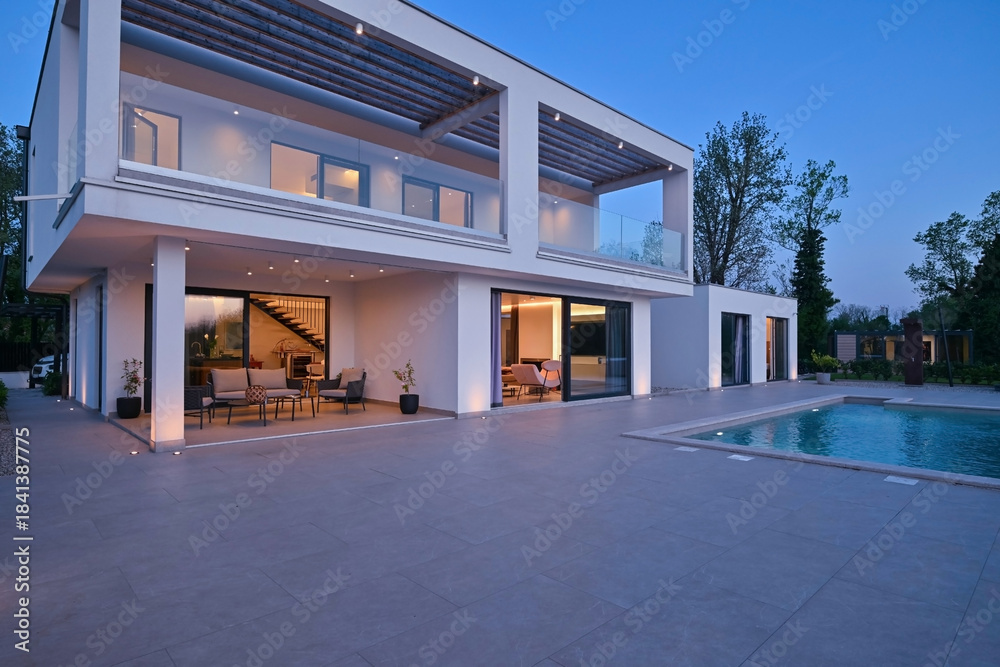 Exterior view of a modern luxury house with a swimming pool at twilight. Illuminated two-story white villa with large glass windows, patio, terrace, and glowing blue water