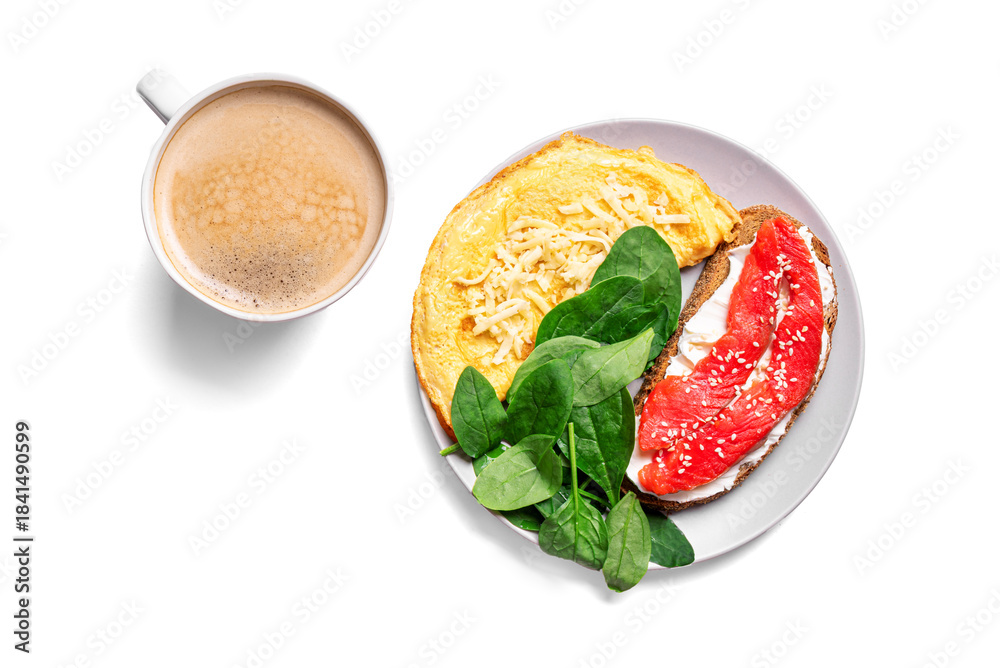 Healthy breakfast plate. Omelette, sandwich with salmon, spinach.