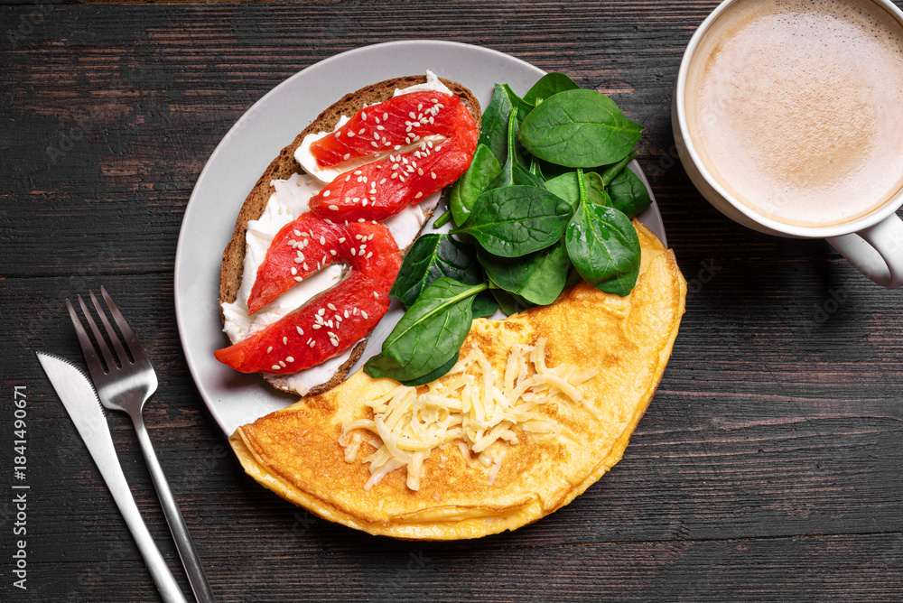 Healthy breakfast plate. Omelette, sandwich with salmon, spinach.