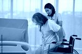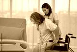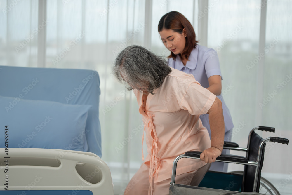 Nurse carries an elderly Asian patient from a bed into a wheelchair, A nurse takes care of patients in a hospital or clinic.