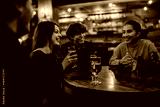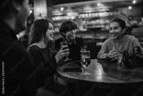 A group of friends sits around a round wooden table in a warmly lit bar, sharing drinks and conversation. Casual, friendly vibes capture a lively nighttime social moment.