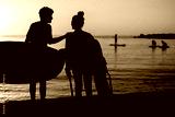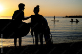 Two young people, friends with surfboard, going for surfing in the sea. Surfers carrying surfboards