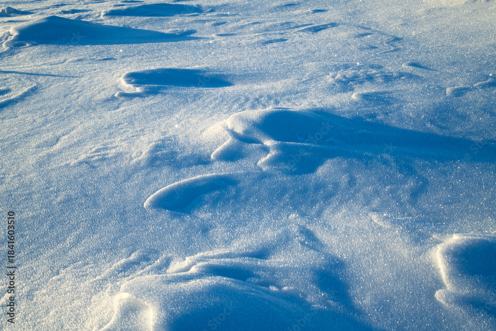Deeply frozen snow surface with wavy structures created by wind drifts on a sunny winter morning in the Sauerland region (Germany). Christmassy background with glittering ice crystals and snowflakes.