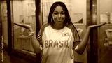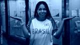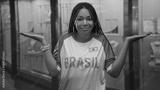 Woman shrugging with palms up in jewelry showcase building, wearing brasil shirt and bracelets; uncertainty doubt.