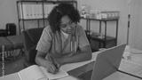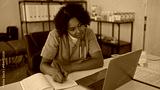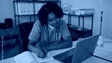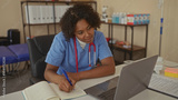 Woman writing notes in notebook with blue pen at clinic desk beside an open laptop; quiet concentration.