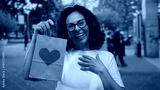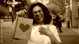 Woman outdoors holding a heart-decorated paper bag on a vibrant street, expressing surprise and joy, capturing a candid middle-age hispanic woman's emotion in the urban scene.