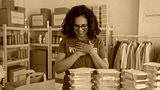 Middle-aged hispanic woman volunteer in green uniform working in charity indoor room surrounded by donation boxes and meal trays, showing appreciation.