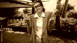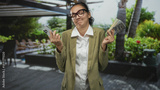 Young hispanic woman holding smartphone and fanned cash, shrugging shoulders while wearing glasses and olive blazer in building poolside patio with palm trees; indifference.