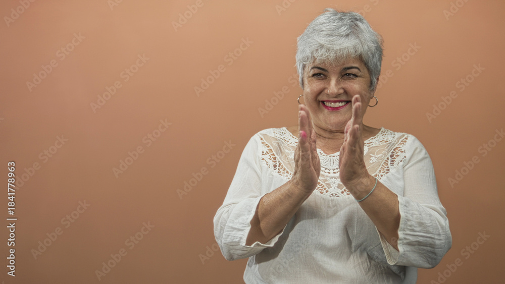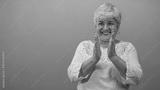Woman clapping hands in studio wearing white lace blouse and hoop earrings, smiling with raised forearms and visible hands; warmth joy.