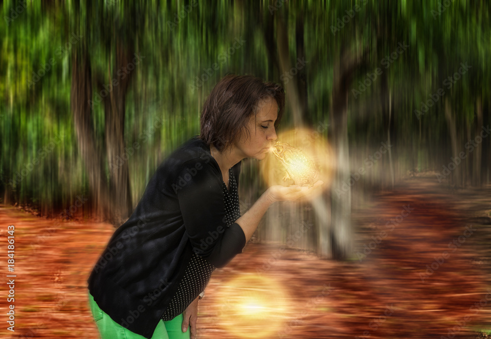 Woman kisses a big frog