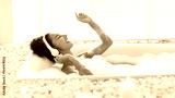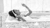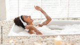 A woman enjoys a relaxing bubble bath in a stylish tub surrounded by stones and candles. She is smiling and dancing to music with headphones on, creating a tranquil atmosphere.