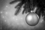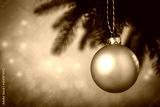 Christmas bauble hanging from a tree branch in soft, warm light. Festive composition perfect for Christmas themes, seasonal greetings, winter holiday promotions and cozy holiday imagery.