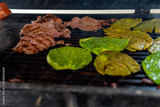 Nopales and carne asada grilling on barbecue