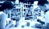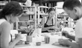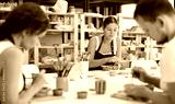 Pottery workers paint ceramic plates together at a table