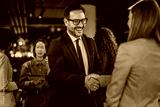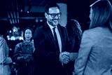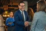 Business people shaking hands celebrating partnership in casual office