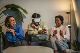 Diverse friends enjoying virtual reality experience and laughing together
