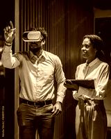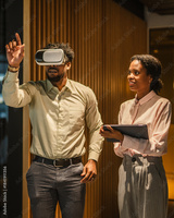 Business colleagues experiencing augmented virtual reality meta verse technology