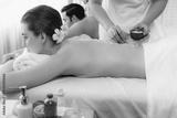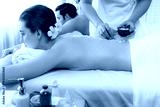Blissful couple customer having exfoliation treatment in luxury spa salon with warmth candle light ambient. Salt scrub beauty treatment in health spa body scrub. Quiescent