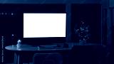 A home office with a blank computer screen a lit candle and a festive Christmas tree