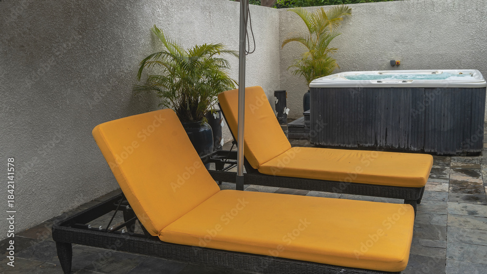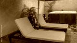 The relaxation area at the spa. Lounge chairs with soft mattresses against the wall. The Jacuzzi is nearby. Palm trees in pots. Tiled floor. Resort