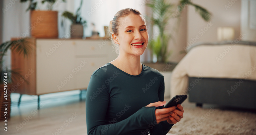 Woman, phone and smile with fitness in home, break and check notification in portrait on floor. Person, smartphone and happy with mobile app, pride or tracking progress for training at house in Spain